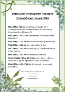 Der Botanische Erlebnisgarten Altenburg ist ein Ort der Begegnung, des Staunens und der Erholung – mitten in unserer Stadt und doch eine Welt für sich. Mit seinen liebevoll gestalteten Pflanzflächen, kreativen Veranstaltungen und Bildungsangeboten für Groß und Klein ist er ein lebendiges Symbol für Naturverbundenheit und Gemeinschaft.